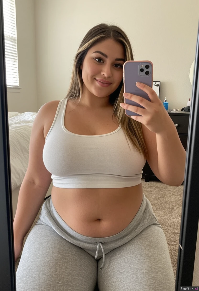 23-year-old latina girl, long brown hair, straight hair, attractive, black-eyes, blonde-highlights, good-looking, symmetrical face, soft-jawline, soft-features, almond-face natural-look curvy, chubby belly, Wearing a tight white tanktop, grey sweatpants, Sitting in bedroom, ((selfie in tje mirror, head tilted)), smiling, holding phone, looking at phone, 4k-masterpiece, dslr, bokeh, best-quality, (bigger fatter lethargic voluptuous thighs: 1.0)