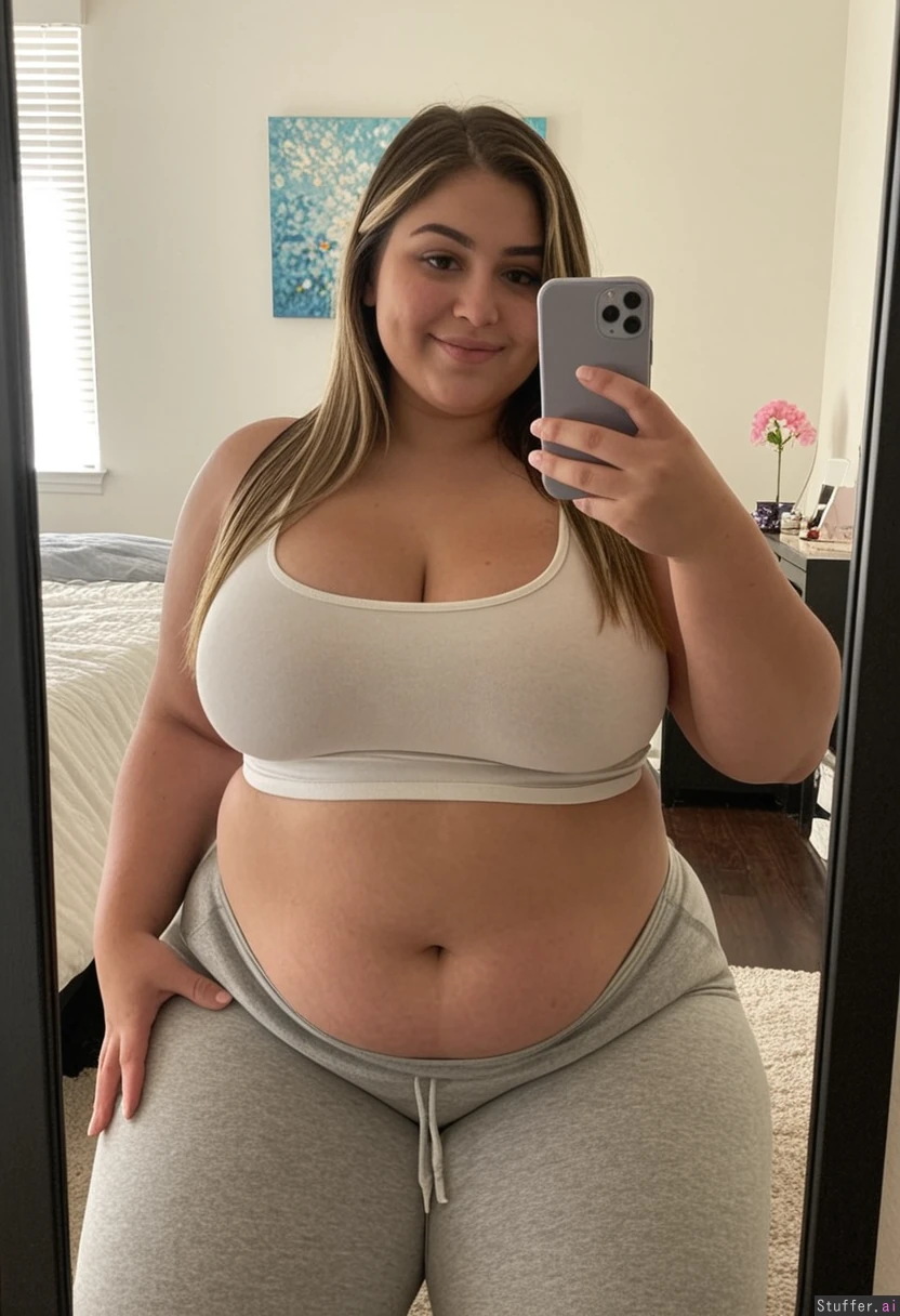23-year-old latina girl, long brown hair, straight hair, attractive, black-eyes, blonde-highlights, good-looking, symmetrical face, soft-jawline, soft-features, almond-face natural-look curvy, chubby belly, Wearing a tight white tanktop, grey sweatpants, Sitting in bedroom, ((selfie in tje mirror, head tilted)), smiling, holding phone, looking at phone, 4k-masterpiece, dslr, bokeh, best-quality, (bigger fatter lethargic voluptuous thighs: 1.3) (fatter wider lethargic voluptuous hips: 1.4)