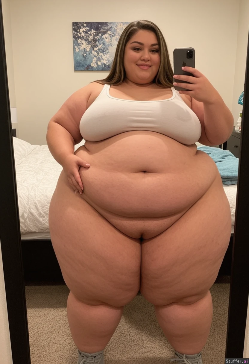 23-year-old latina girl, long brown hair, straight hair, attractive, black-eyes, blonde-highlights, good-looking, symmetrical face, soft-jawline, soft-features, almond-face natural-look curvy, chubby belly, Wearing a tight white tanktop, grey sweatpants, Sitting in bedroom, ((selfie in tje mirror, head tilted)), smiling, holding phone, looking at phone, 4k-masterpiece, dslr, bokeh, best-quality, (bigger fatter lethargic voluptuous thighs: 1.9) (fatter wider lethargic voluptuous hips: 1.9) massively obese and immobile, humongous overly obese thighs, overhanging low hanging heavy obese bulging belly