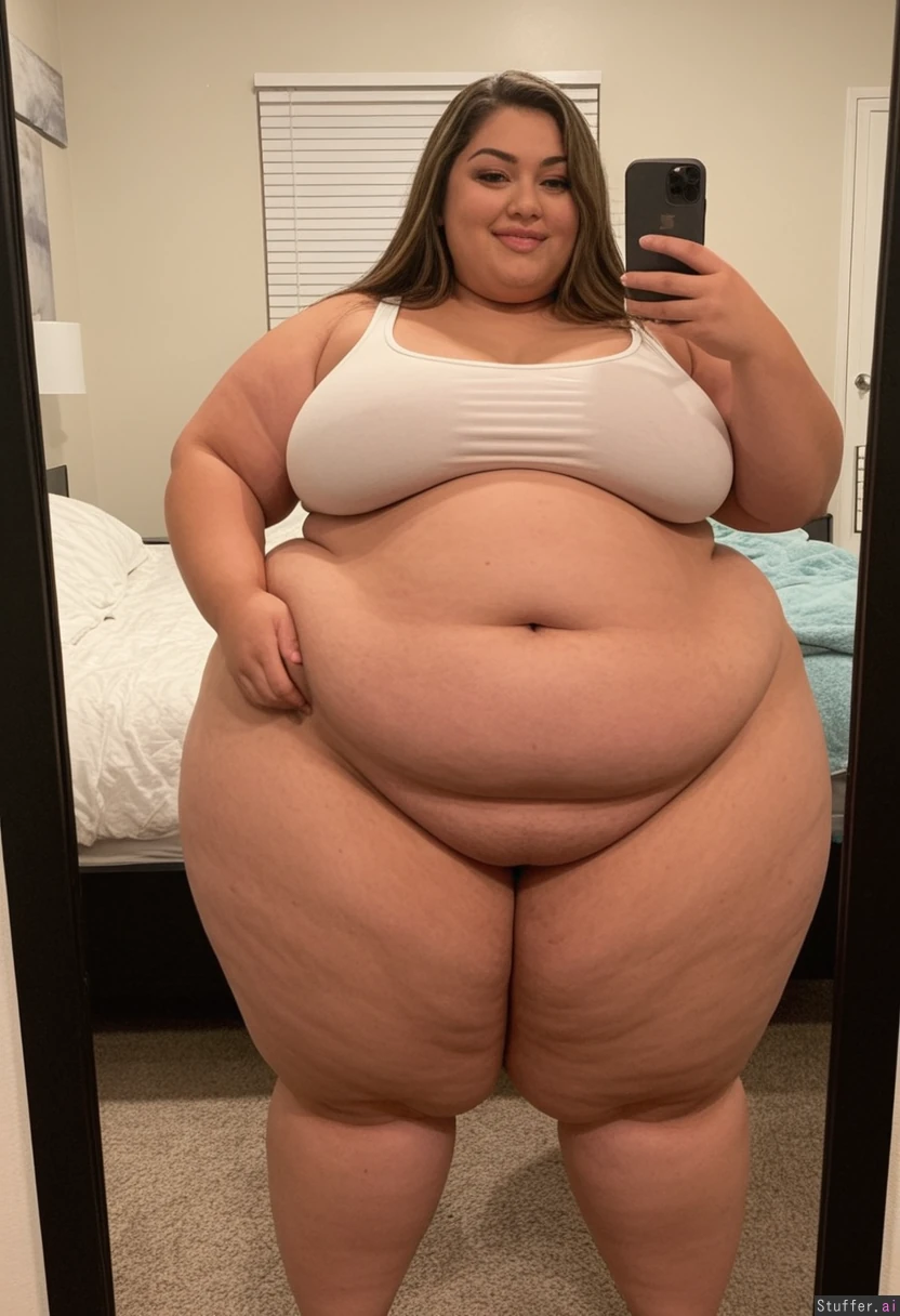 23-year-old latina girl, long brown hair, straight hair, attractive, black-eyes, blonde-highlights, good-looking, symmetrical face, soft-jawline, soft-features, almond-face natural-look curvy, chubby belly, Wearing a tight white tanktop, grey sweatpants, Sitting in bedroom, ((selfie in tje mirror, head tilted)), smiling, holding phone, looking at phone, 4k-masterpiece, dslr, bokeh, best-quality, (bigger fatter lethargic voluptuous thighs: 1.9) (fatter wider lethargic voluptuous hips: 1.9) massively obese and immobile, humongous overly obese thighs, overhanging low hanging heavy obese bulging belly (bigger fatter lethargic voluptuous belly: 1.6)