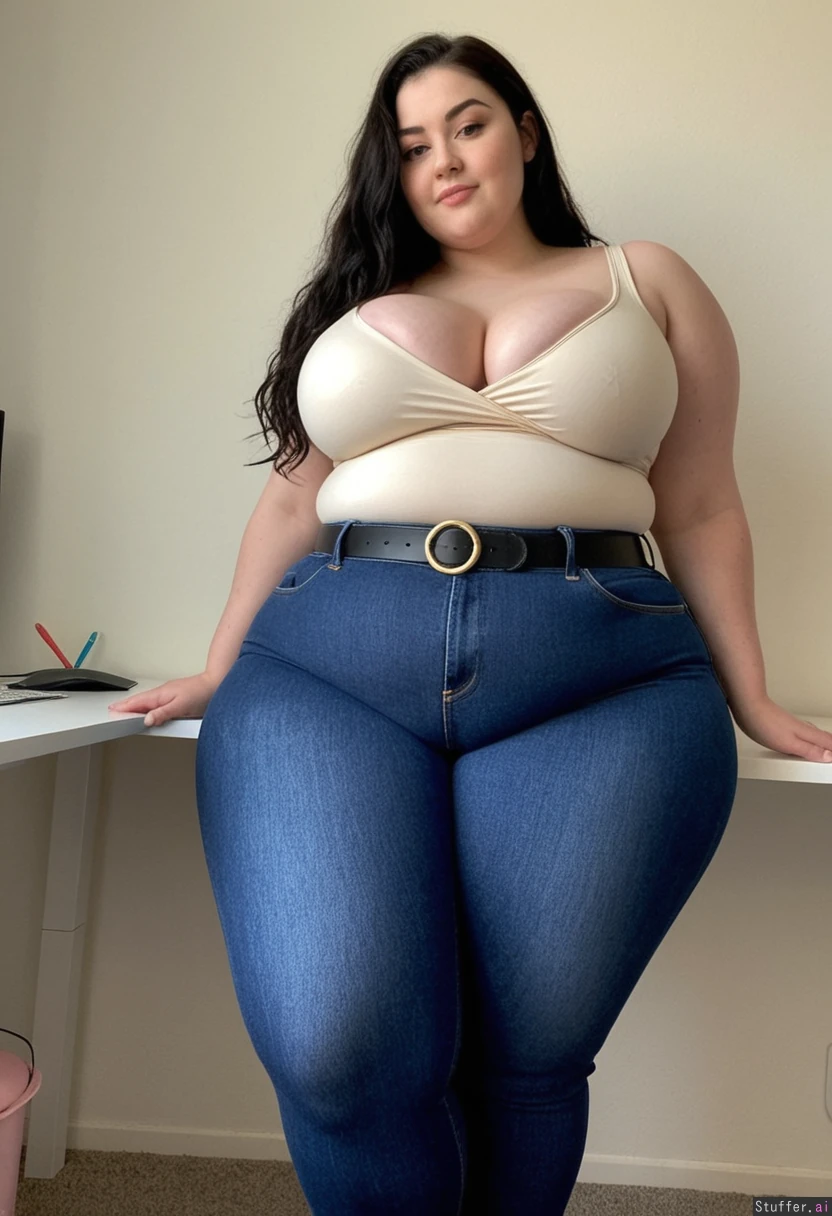 Cute young (hyper_voluptuous chubby chunky flabby pudgy thick curvy:1.4) French-German bombshell woman in her early 20s sitting in office chair at office desk, (round ample soft squishy curves:1.6). (Full body view). (Immaculate gorgeous ethereal cute soft fat model face). Upturned aesthetic nose. Lush black hair, (Light soft smooth pale porcelain skin). (Tight high waisted jeans, plain skintight top tucked into jeans, belt, bulging cleavage:1.5) (Soft squishy heavy jiggly growing breasts:1.4). (Snatched soft waist:1.4), (Chubby midriff). ((Wide soft hips:1.7)) ((Thick round squishy wide thighs:1.5)). Delicate hands, arms loosely hanging to sides, Blushing, shy, soft smile, slightly embarrassed. Realistic, perfect anatomy. (16k, highest quality, perfect anatomy, sharp details). (DSLR photo).