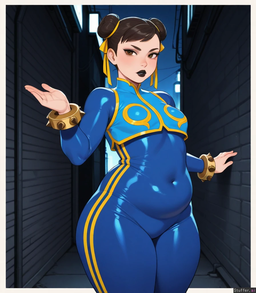 Solo, KAMII MOMORU(artist), ((chun li fortnite)), horny, ((tight bodysuit)), ((alt girl, black lipstick, plump lips)), small breasts, ((thick, chubby:1.2)), (serious face), (sexy pose, sexy), thick thighs, round belly, standing, in alley, night, medium breasts, Dramatic lighting, ((looking at viewer))