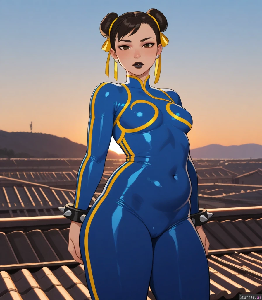 Solo, KAMII MOMORU(artist), ((chun li fortnite)), horny, ((tight bodysuit)), ((alt girl, black lipstick, plump lips)), small breasts, ((thick, chubby:1.2)), (serious face), (sexy pose, sexy), thick thighs, round belly, standing, on roof, golden hour, medium breasts, Dramatic lighting, ((looking at viewer))