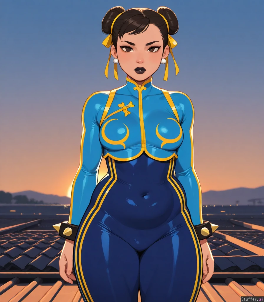 Solo, KAMII MOMORU(artist), ((chun li fortnite)), horny, ((tight bodysuit)), ((alt girl, black lipstick, plump lips)), small breasts, ((thick, chubby:1.2)), (serious face), (sexy pose, sexy), thick thighs, round belly, standing, on roof, golden hour, medium breasts, Dramatic lighting, ((looking at viewer))