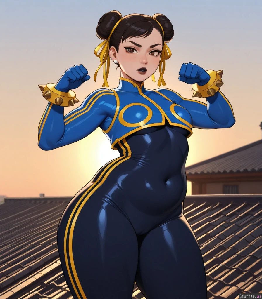 Solo, KAMII MOMORU(artist), ((chun li fortnite)), horny, ((tight bodysuit)), ((alt girl, black lipstick, plump lips)), small breasts, ((thick, chubby:1.2)), (serious face), (sexy pose, sexy:1.2), thick thighs, round belly, standing, on roof, golden hour, medium breasts, Dramatic lighting, ((looking at viewer))