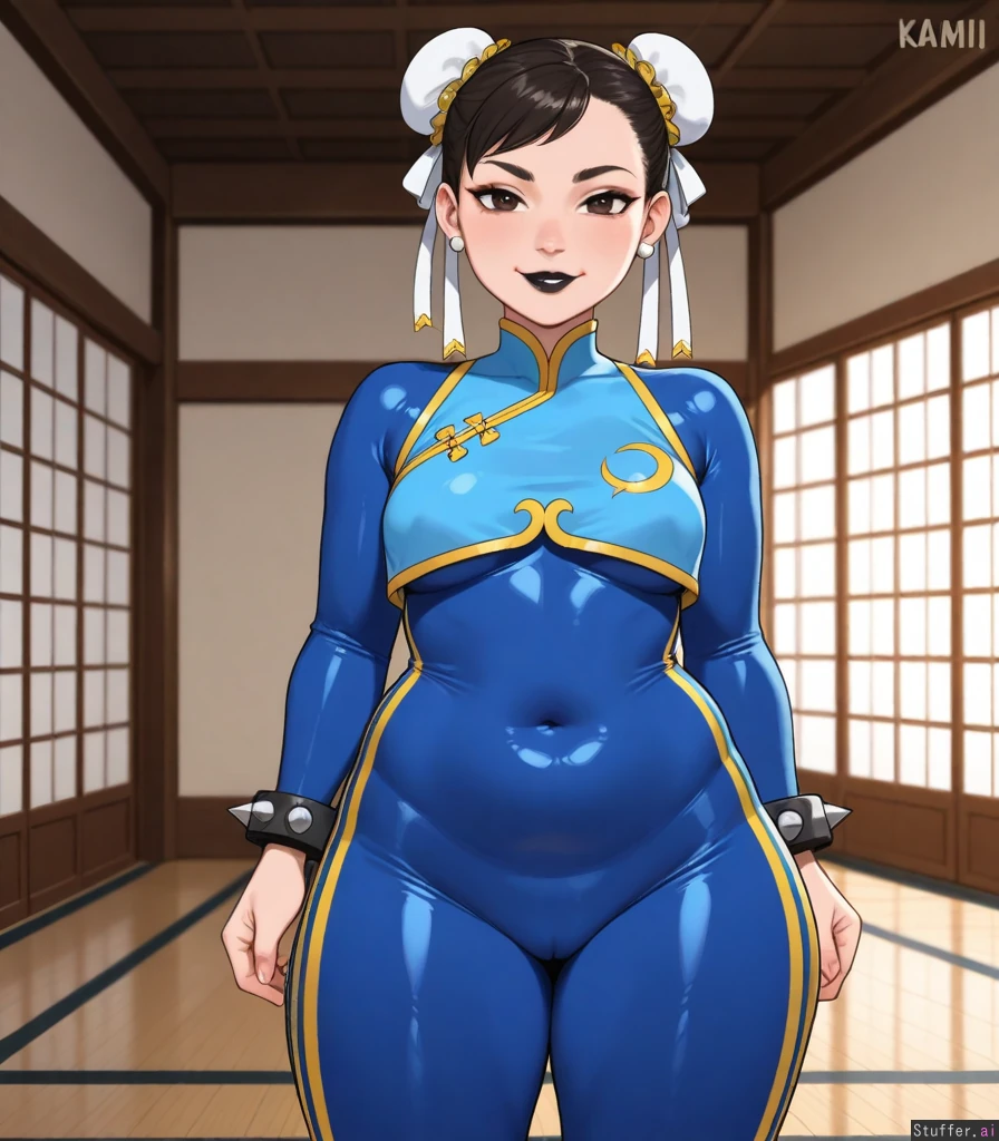 Solo, KAMII MOMORU(artist), (chun li fortnite), horny, ((tight bodysuit, crop top)), ((beautiful girl, black lipstick, plump lips)), small breasts, ((thick, chubby:1.2)), (smirk), (sexy pose, sexy), thick thighs, round belly, standing, in dojo, golden hour, medium breasts, Dramatic lighting, ((looking at viewer))