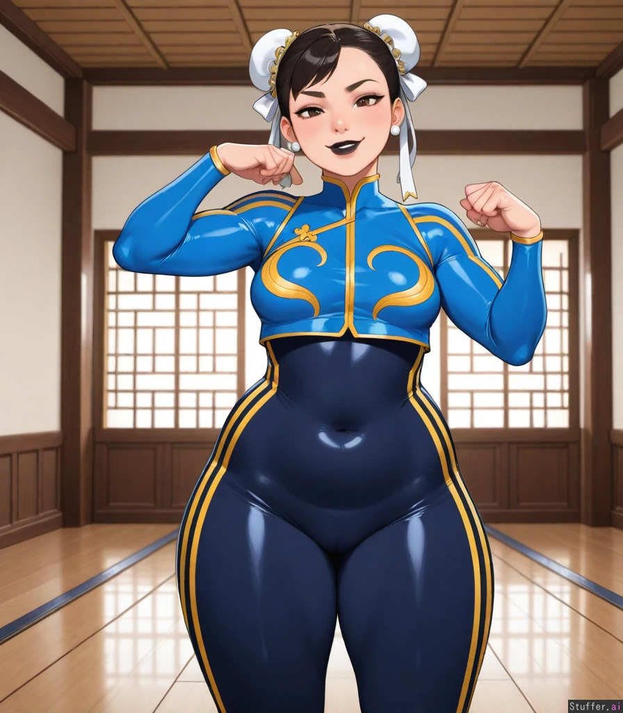 Solo, KAMII MOMORU(artist), (chun li fortnite), horny, ((tight bodysuit, crop top)), ((beautiful girl, black lipstick, plump lips)), small breasts, ((thick, chubby:1.2)), (smirk), (sexy pose, sexy), thick thighs, round belly, standing, in dojo, golden hour, medium breasts, Dramatic lighting, ((looking at viewer))