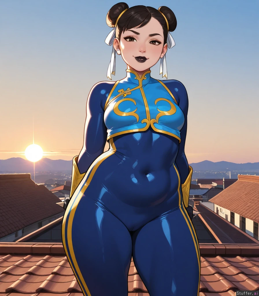 Solo, KAMII MOMORU(artist), (chun li fortnite), horny, ((tight bodysuit, crop top)), ((alt girl, black lipstick, plump lips)), small breasts, ((curvy, chubby:1.2)), (smirk), (sexy pose, sexy), thick thighs, round belly, standing, on roof, golden hour, medium breasts, Dramatic lighting, ((looking at viewer))