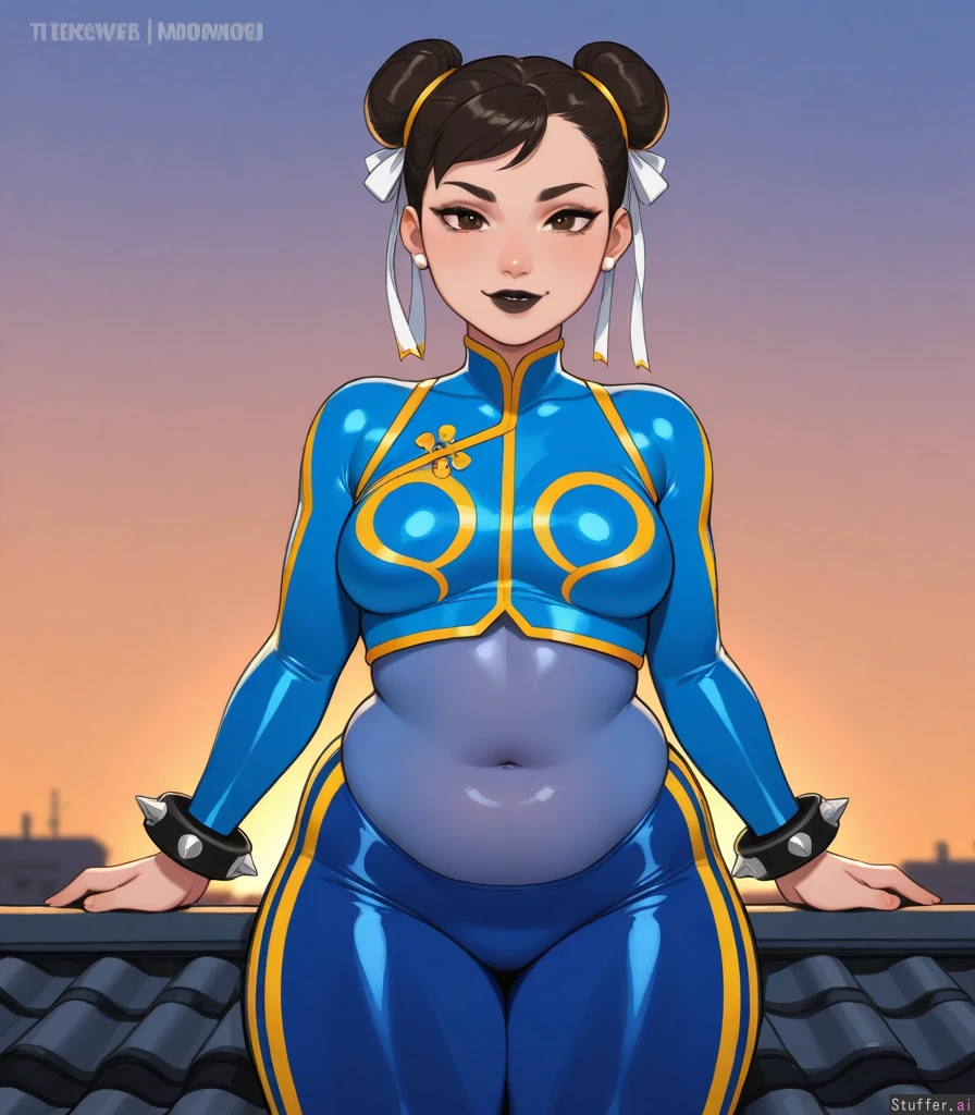 Solo, KAMII MOMORU(artist), (chun li fortnite), horny, ((tight bodysuit, crop top)), ((alt girl, black lipstick, plump lips)), small breasts, ((curvy, chubby:1.2)), (smirk), (sexy pose, sexy), thick thighs, round belly, standing, on roof, golden hour, medium breasts, Dramatic lighting, ((looking at viewer))