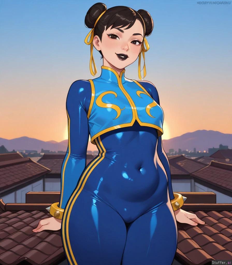 Solo, KAMII MOMORU(artist), (chun li fortnite), horny, ((tight bodysuit, crop top)), ((alt girl, black lipstick, plump lips)), small breasts, ((curvy, chubby:1.2)), (smirk), (sexy pose, sexy), thick thighs, round belly, standing, on roof, golden hour, medium breasts, Dramatic lighting, ((looking at viewer))