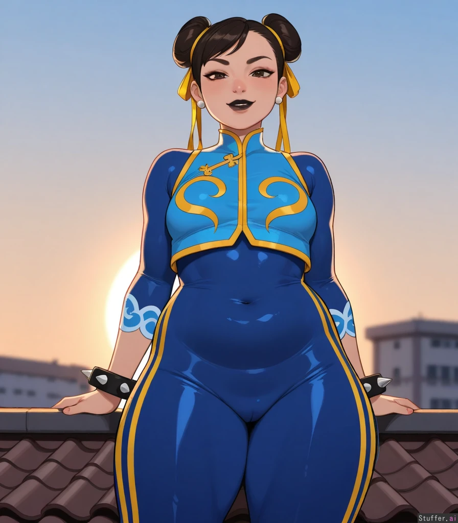 Solo, KAMII MOMORU(artist), (chun li fortnite), horny, ((tight bodysuit, crop top)), ((alt girl, black lipstick, plump lips)), small breasts, ((curvy, chubby:1.2)), (smirk), (sexy pose, sexy), thick thighs, round belly, standing, on roof, golden hour, medium breasts, Dramatic lighting, ((looking at viewer))