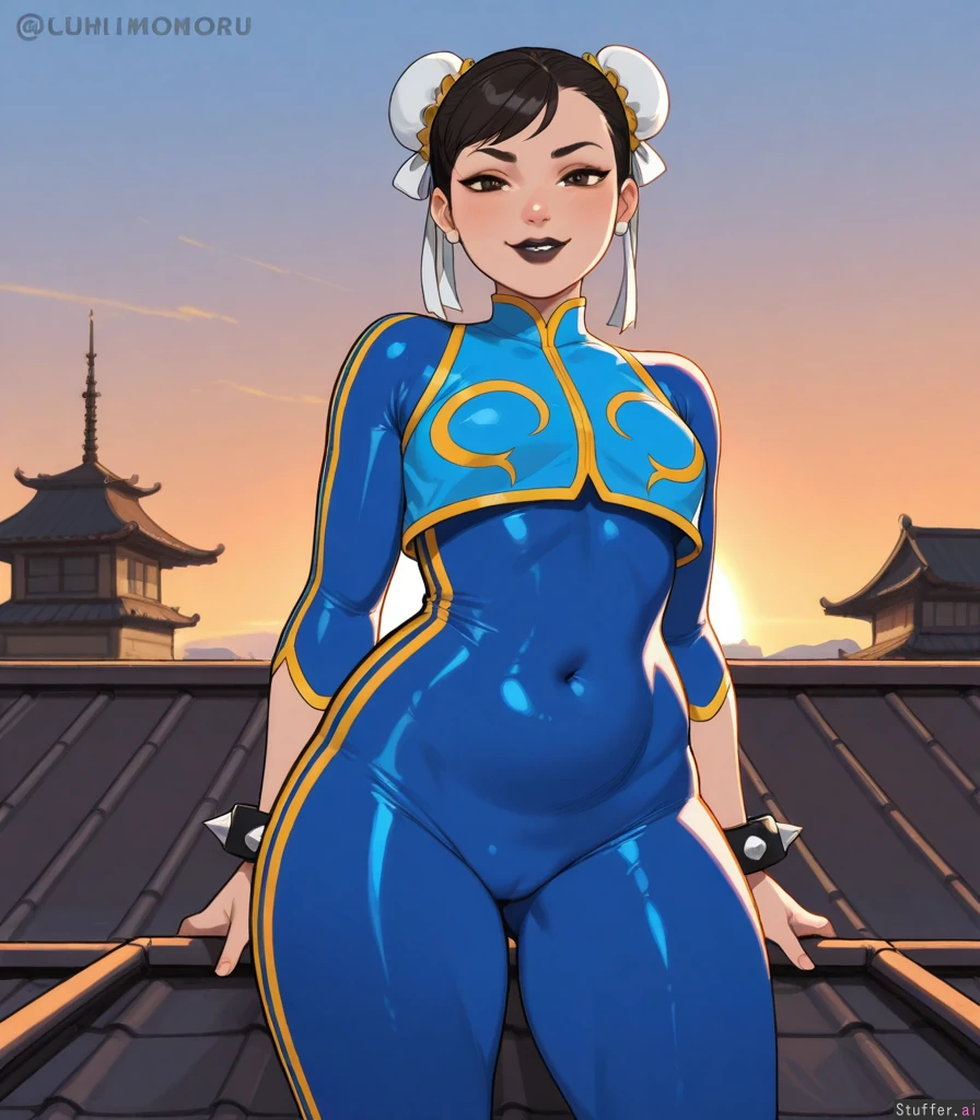 Solo, KAMII MOMORU(artist), (chun li fortnite), horny, ((tight bodysuit, crop top)), ((alt girl, black lipstick, plump lips)), small breasts, ((curvy, chubby:1.2)), (smirk), (sexy pose, sexy), thick thighs, round belly, standing, on roof, golden hour, medium breasts, Dramatic lighting, ((looking at viewer))