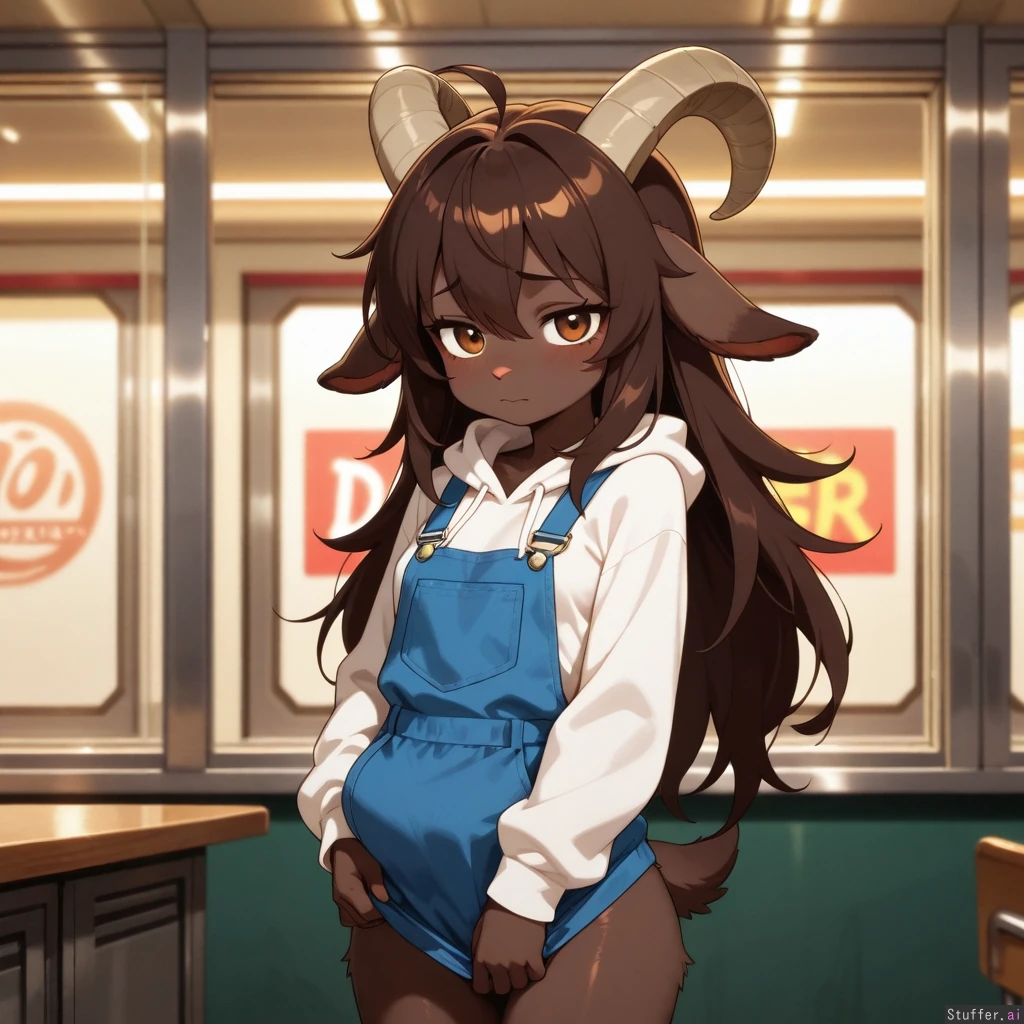 Amazing quality, High Rating, high definition, HD, defined outlines, anime art style, beautiful_eyes, sharp shadows, vibrant lighting, single, solo, one(1) character, furry, anthro, anthro goat, caprine species, white hoodie, opaque clothes, cloth wrinkles, small breasts, bottomless, long hair, dark brown fur, shy, wide hips, holding_belly, diner background, nipple outline, (overall, its a masterpiece of anime art, with amazing defined outlines)