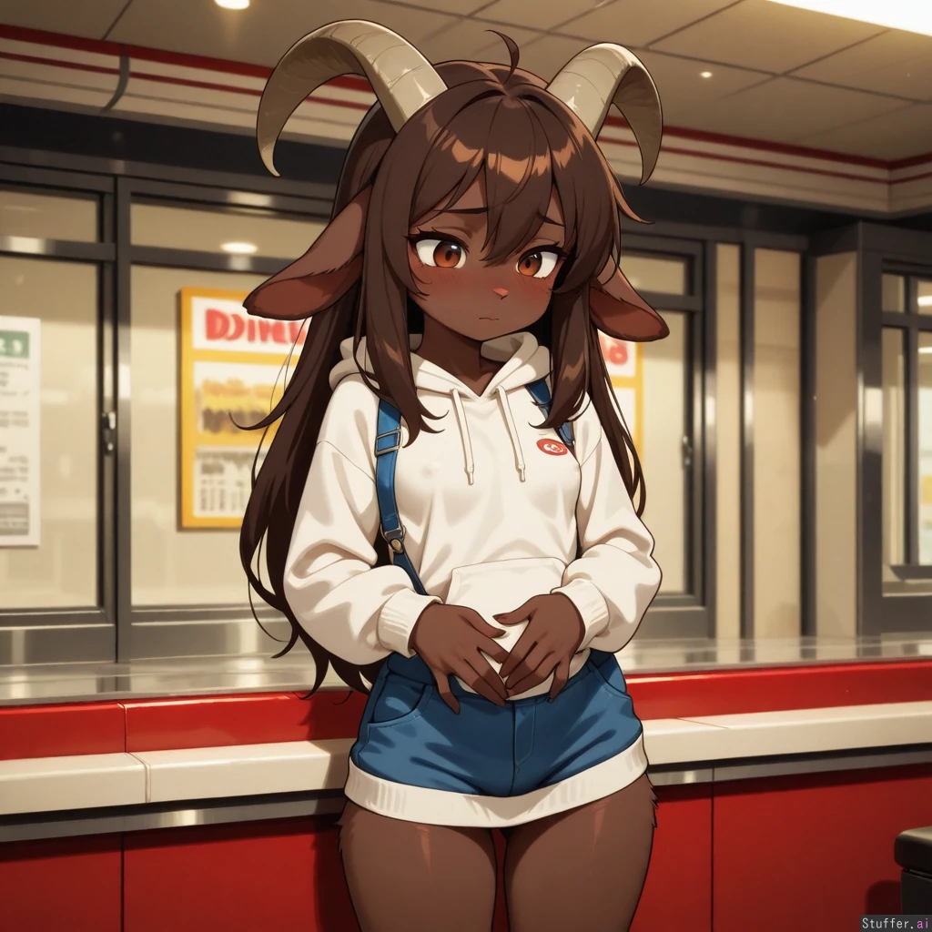 Amazing quality, High Rating, high definition, HD, defined outlines, anime art style, beautiful_eyes, sharp shadows, vibrant lighting, single, solo, one(1) character, furry, anthro, anthro goat, caprine species, white hoodie, opaque clothes, cloth wrinkles, small breasts, bottomless, long hair, dark brown fur, shy, wide hips, holding_belly, diner background, nipple outline, (overall, its a masterpiece of furry art, with amazing defined outlines)
