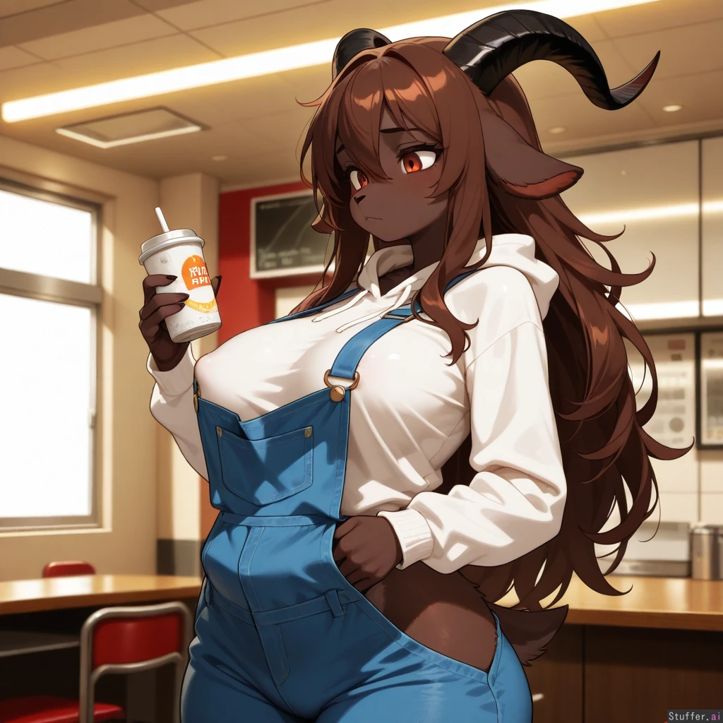 Amazing quality, High Rating, high definition, HD, defined outlines, anime art style, beautiful_eyes, sharp shadows, vibrant lighting, single, solo, one(1) character, furry, anthro, anthro goat, caprine species, white hoodie, opaque clothes, cloth wrinkles, breasts, bottomless, long hair, dark brown fur, shy, wide hips, holding_belly, diner background, nipple outline, (overall, its a masterpiece of furry art, with amazing defined outlines)