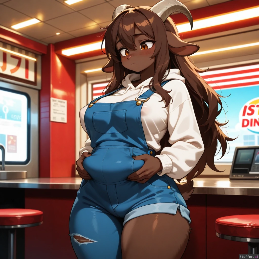 Amazing quality, High Rating, high definition, HD, defined outlines, anime art style, beautiful_eyes, sharp shadows, vibrant lighting, single, solo, one(1) character, furry, anthro, anthro goat, caprine species, white hoodie, opaque clothes, cloth wrinkles, breasts, long hair, dark brown fur, shy, wide hips, overalls, partially exposed thigh(s), holding_belly, diner background, nipple outline, (overall, its a masterpiece of furry art, with amazing defined outlines)