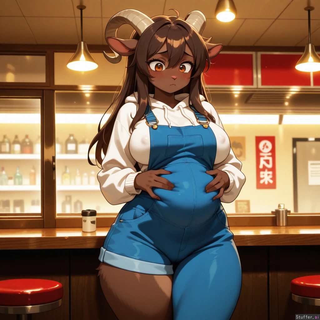 Amazing quality, High Rating, high definition, HD, defined outlines, anime art style, beautiful_eyes, sharp shadows, vibrant lighting, single, solo, one(1) character, furry, anthro, anthro goat, caprine species, white hoodie, opaque clothes, cloth wrinkles, breasts, long hair, dark brown fur, shy, wide hips, overalls, partially exposed thigh(s), holding_belly, diner background, nipple outline, (overall, its a masterpiece of furry art, with amazing defined outlines)