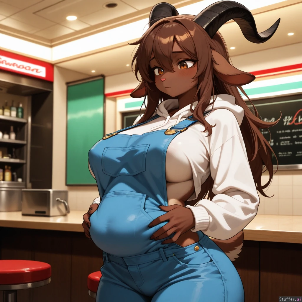 Amazing quality, High Rating, high definition, HD, defined outlines, furry art style, beautiful_eyes, sharp shadows, vibrant lighting, single, solo, one(1) character, furry, anthro, anthro goat, caprine species, white hoodie, opaque clothes, cloth wrinkles, breasts, long hair, dark brown fur, shy, wide hips, overalls, partially exposed waist, holding_belly, diner background, nipple outline, (overall, its a masterpiece of furry art, with amazing defined outlines)