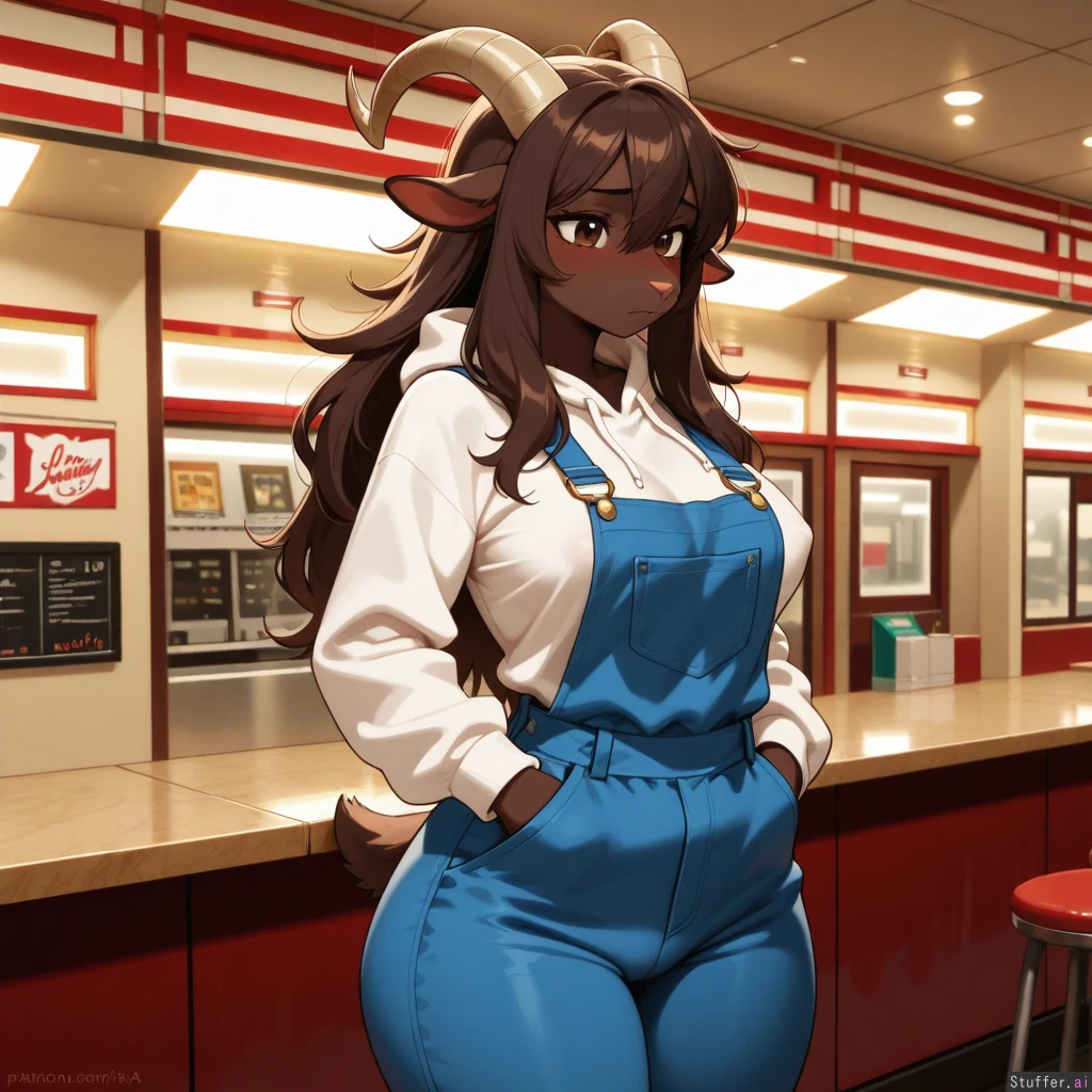 Amazing quality, High Rating, high definition, HD, defined outlines, furry art style, beautiful_eyes, sharp shadows, vibrant lighting, single, solo, one(1) character, furry, anthro, anthro goat, caprine species, goat-like nose, white hoodie, opaque clothes, cloth wrinkles, breasts, long hair, dark brown fur, shy, wide hips, overalls, partially exposed waist, hands in pockets, diner background, nipple outline, (overall, its a masterpiece of furry art, with amazing defined outlines)