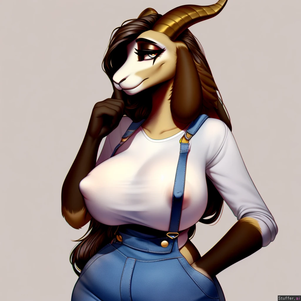 best quality, high rating, Amazing quality, High Rating, high definition, HD, defined outlines, furry art style, beautiful_eyes, sharp shadows, vibrant lighting, single, solo, one(1) character, furry, anthro, anthro goat, caprine species, goat-like nose, white hoodie, opaque clothes, cloth wrinkles, breasts, long hair, dark brown fur, shy, wide hips, overalls, partially exposed waist, hands in pockets, nipple outline, (overall, its a masterpiece of furry art, with amazing defined outlines)