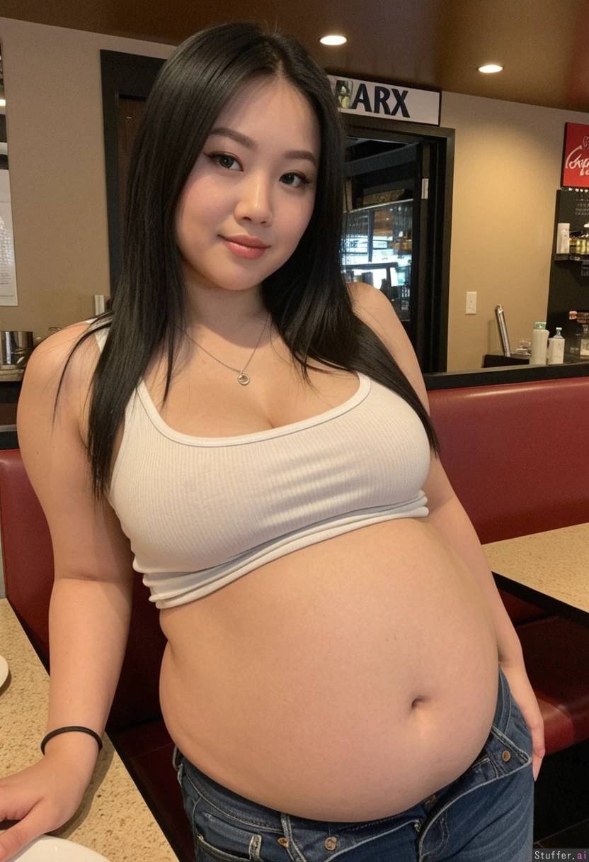 An Asian baddie is at a restaurant. She is standing ((sideways)). She has long black straight hair with a center part. Her face has soft features with a flirty expression, slightly pursed lips, and subtle makeup that enhances her natural look. Eyeliner. She wears a silver necklace. She is dressed in a tank top and jeans. (pouch belly). The picture depicts a restaurant, add a casual, realistic touch. The lighting is moody and natural, evenly illuminating her face and full body. Shrink breasts one cup size Enlarge belly Add 10lbs (((Very soft very big very thick lower belly)))