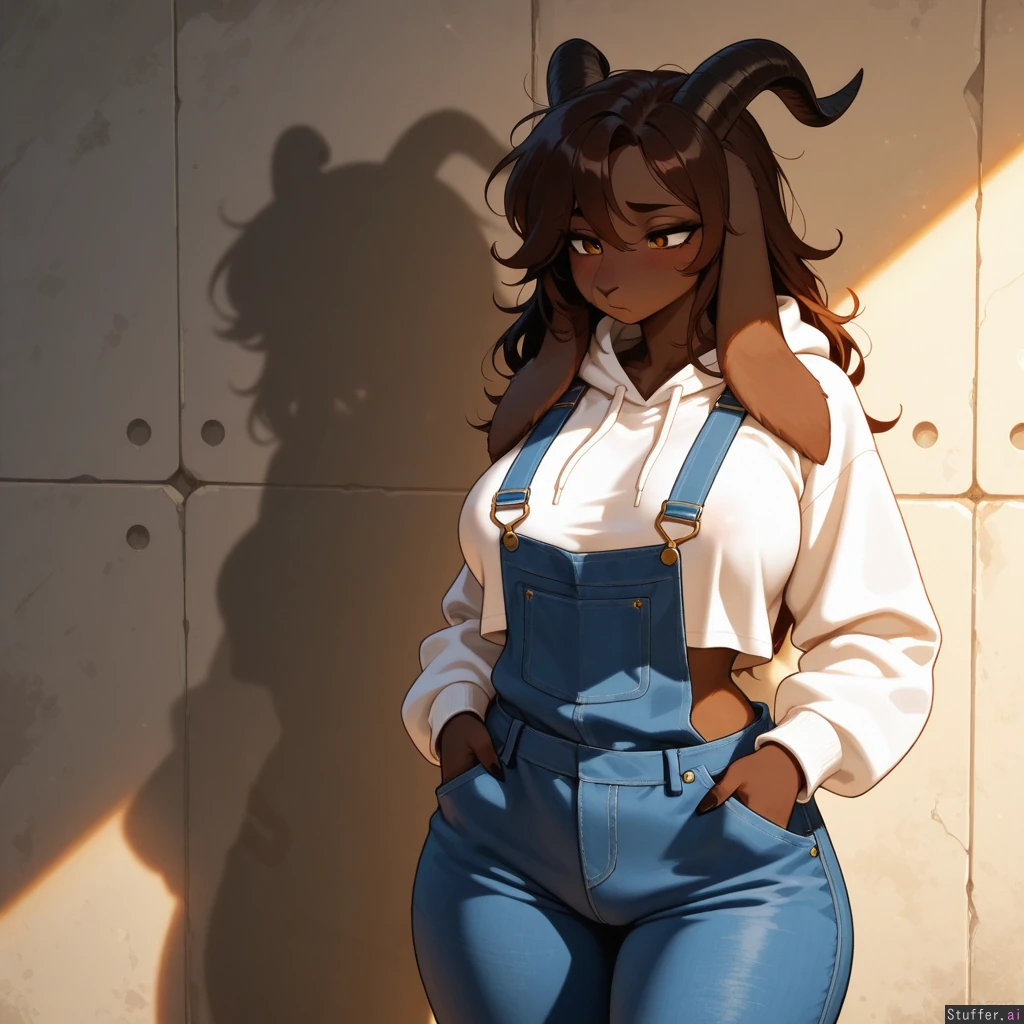 Amazing quality, High Rating, high definition, HD, defined outlines, furry art style, beautiful_eyes, sharp shadows, vibrant lighting, single, solo, one(1) character, furry, anthro, anthro goat, caprine species, goat-like nose, white hoodie, opaque clothes, cloth wrinkles, breasts, long hair, dark brown fur, shy, wide hips, overalls, partially exposed waist, hands in pockets, nipple outline, (overall, its a masterpiece of furry art, with amazing defined outlines)