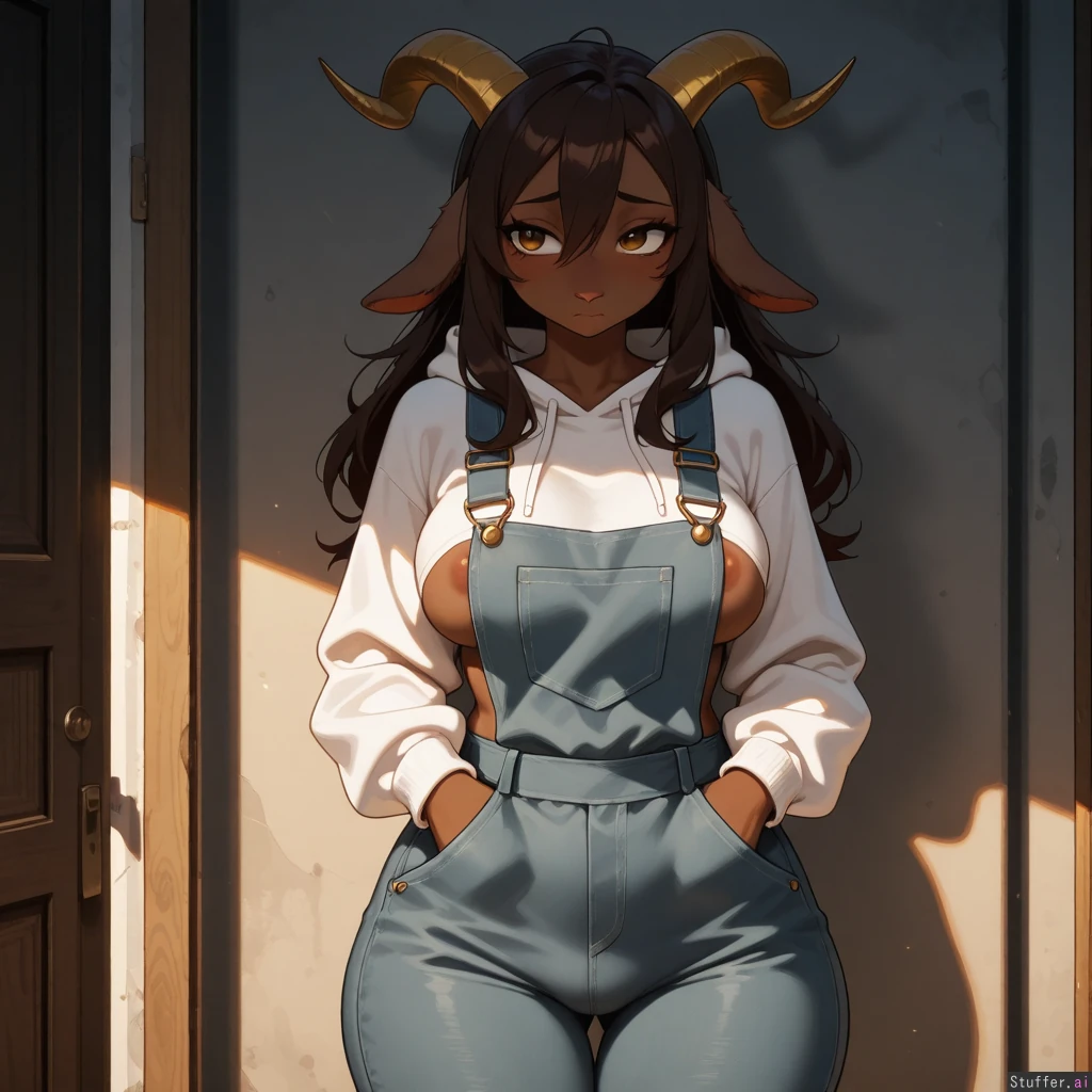 Amazing quality, High Rating, high definition, HD, defined outlines, furry art style, beautiful_eyes, sharp shadows, vibrant lighting, single, solo, one(1) character, furry, anthro, anthro goat, caprine species, goat-like nose, white hoodie, opaque clothes, cloth wrinkles, breasts, long hair, dark brown fur, shy, wide hips, overalls, partially exposed waist, hands in pockets, nipple outline, (overall, its a masterpiece of furry art, with amazing defined outlines)