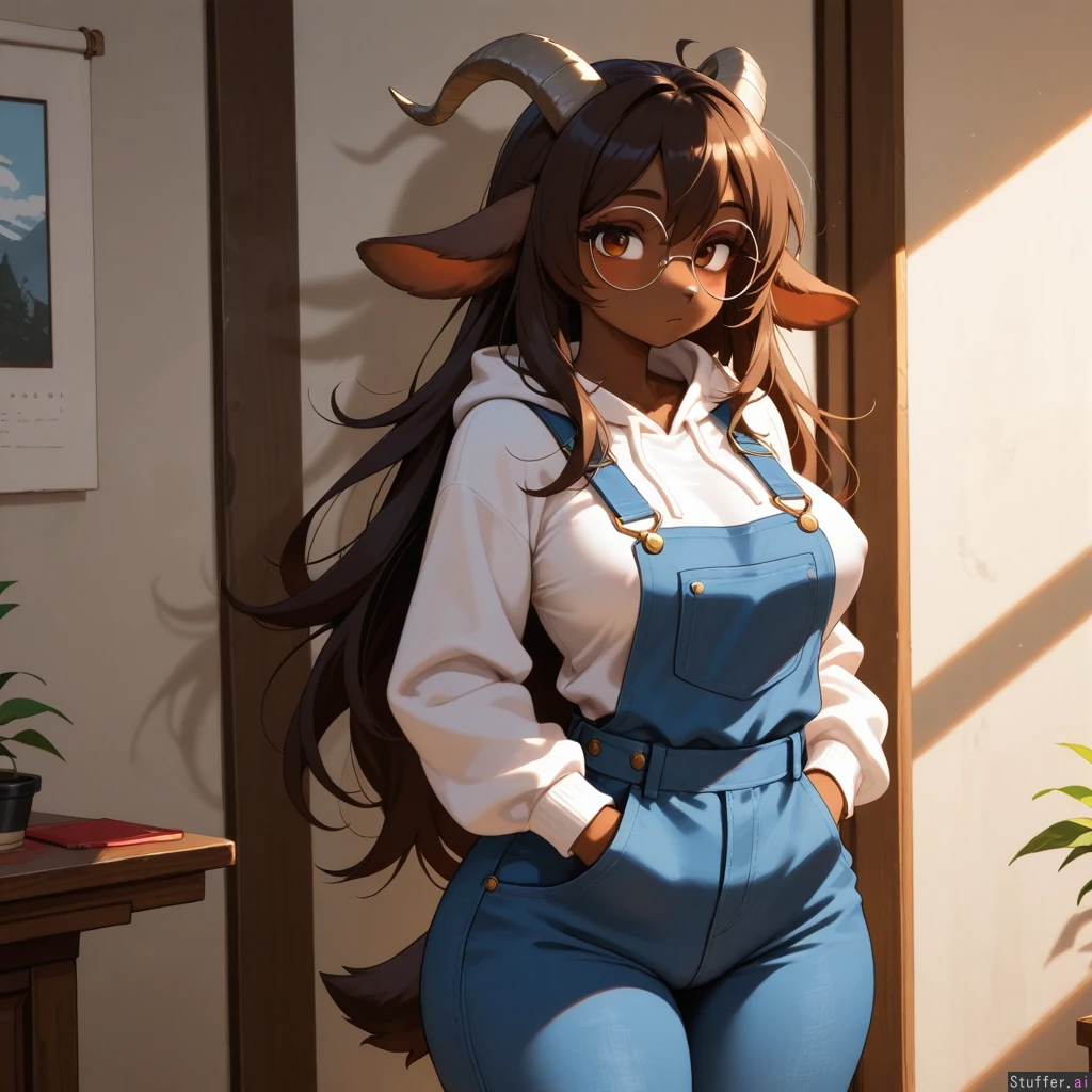 Amazing quality, High Rating, high definition, HD, defined outlines, furry art style, beautiful_eyes, sharp shadows, vibrant lighting, single, solo, one(1) character, furry, anthro, anthro goat, caprine species, goat-like nose, white hoodie, opaque clothes, cloth wrinkles, breasts, long hair, dark brown fur, nerdy, circle frame glasses, wide hips, overalls, partially exposed waist, hands in pockets, nipple outline, (overall, its a masterpiece of furry art, with amazing defined outlines)