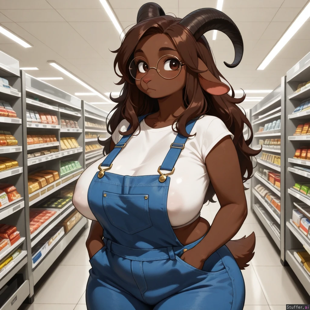 Amazing quality, High Rating, high definition, HD, defined outlines, furry art style, beautiful_eyes, sharp shadows, single, solo, one(1) character, furry, anthro, anthro goat, chubby, caprine species, goat-like snout, nostril_slits, high-cut crop top, opaque clothes, cloth wrinkles, large sagging breasts, long hair, dark brown fur, nerdy, circle frame glasses, wide hips, overalls, public supermarket, averted gaze, hands in pockets, nipple outline, anthro_people_in_background (overall, its a masterpiece of furry art, with amazing defined outlines)