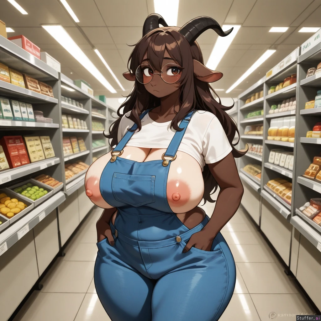 Amazing quality, High Rating, high definition, HD, defined outlines, furry art style, beautiful_eyes, sharp shadows, single, solo, one(1) character, furry, anthro, anthro goat, chubby, chubby_cheekscaprine species, goat-like snout, nostril_slits, high-cut crop top, exposed breasts, opaque clothes, cloth wrinkles, large sagging breasts, long hair, dark brown fur, flustered, circle frame glasses, wide hips, overalls, public supermarket, averted gaze, hands in pockets, nipple outline, anthro_people_in_background (overall, its a masterpiece of furry art, with amazing defined outlines)