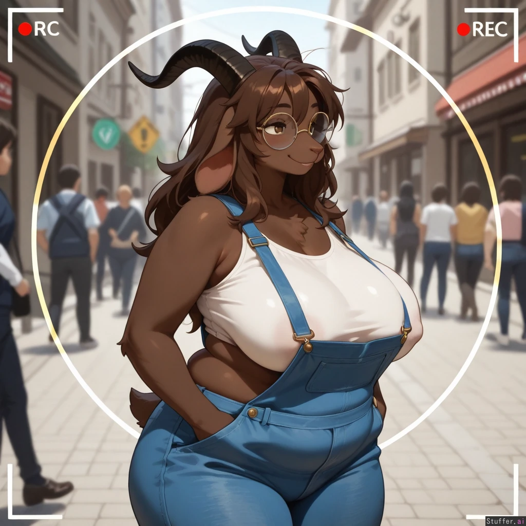 Amazing quality, High Rating, high definition, HD, defined outlines, furry art style, beautiful_eyes, sharp shadows, single, solo, one(1) character, furry, anthro, anthro goat, chubby, fat hanging belly, chubby_cheeks, caprine species, goat-like snout, nostril_slits, high-cut crop top, exposed breasts, opaque clothes, cloth wrinkles, large sagging breasts, long hair, dark brown fur, naive smile, circle frame glasses, wide hips, overalls, public, averted gaze, hands in pockets, nipple outline, anthro_people_in_background