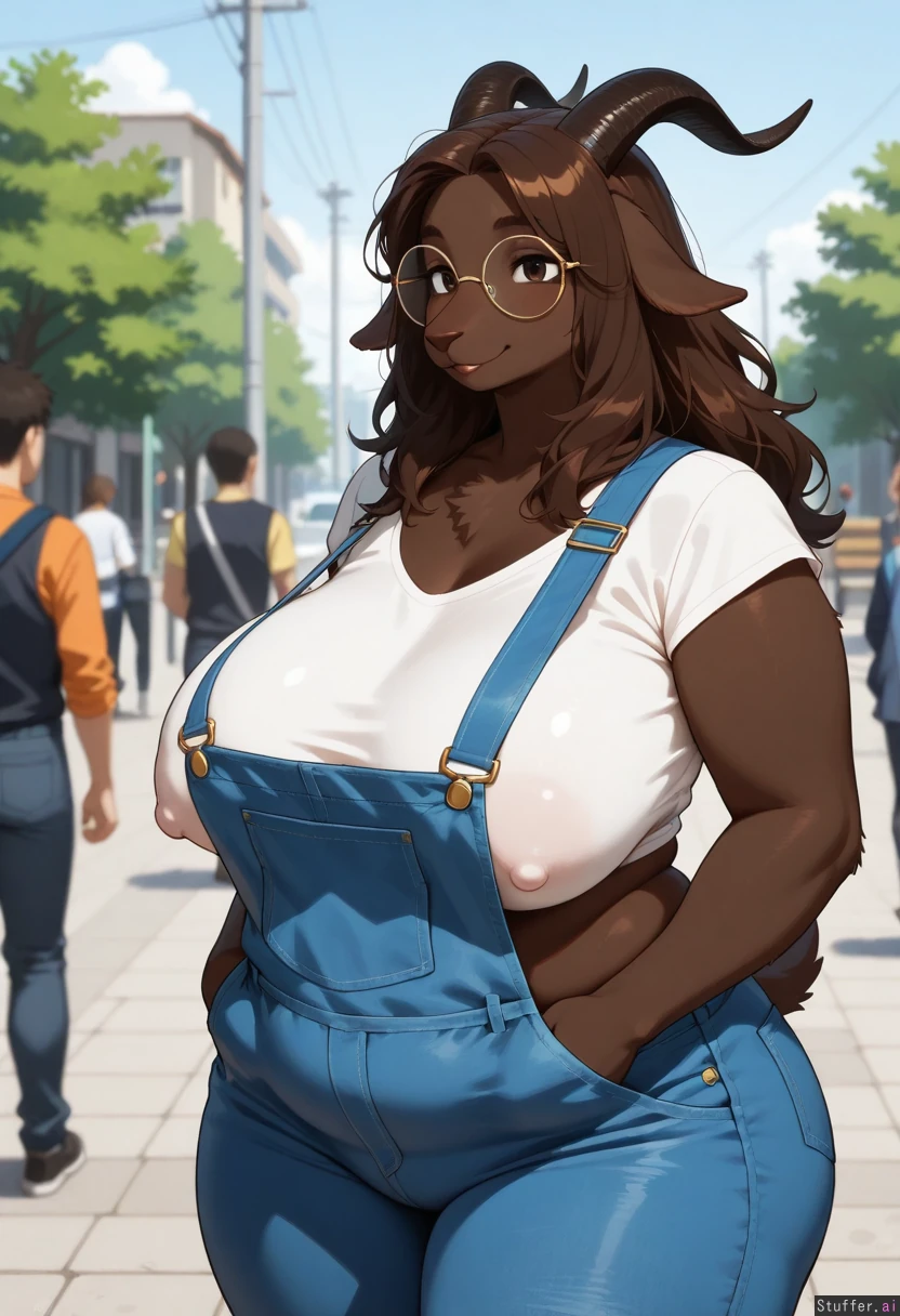 Amazing quality, High Rating, high definition, HD, defined outlines, furry art style, beautiful_eyes, sharp shadows, single, solo, one(1) character, furry, anthro, anthro goat, chubby, fat hanging belly, chubby_cheeks, caprine species, goat-like snout, nostril_slits, high-cut crop top, exposed breasts, opaque clothes, cloth wrinkles, large sagging breasts, long hair, dark brown fur, naive smile, circle_frame_glasses, wide hips, overalls, public, averted gaze, hands in pockets, nipple outline, anthro_people_in_background