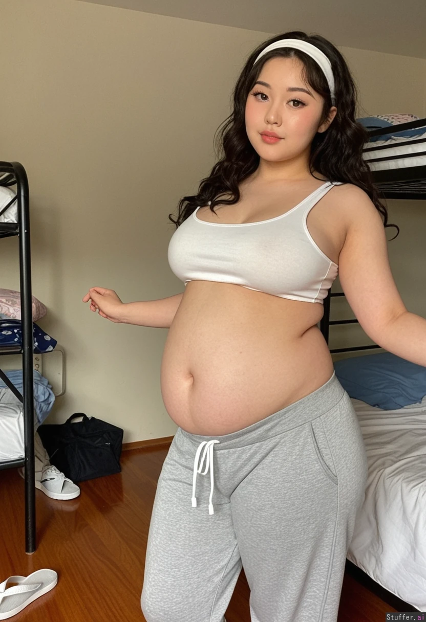 Pretty 25 year old Korean girl with shoulder length wavy dark hair wearing a full coverage white tank top and loose baggy gray sweatpants and a white hairband and white flip flops at her dorm Curvy body Much Smaller boobs Narrow shoulders Narrow waist Skinny arms Wide hips Skinny face Skinny chest Big eyes Eyeliner (((Thick_thighs))) (Sultry pose) (((Soft big thick belly)))