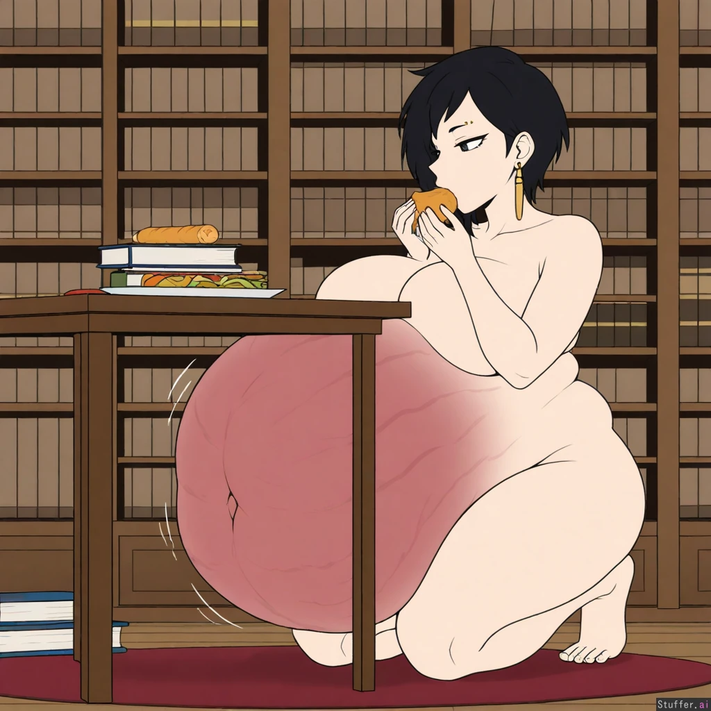 highest quality, highest resolution, full body, ((flat color)), simple shading, eikasianspire, (artist: Kay_inthedark) ((mature woman)), ((library_of_ruina binah)), ((binah)), ((binah fat belly)), earring, (tall), black hair, chubby, bloated stuffed belly, overfilled stomach, heavy stretch marks, taught belly, Nude, side-front_profile, small ((vore belly)) Buffet, eating, tables full of food, nauseous, overstuffed, uncomfortably full, ((on her hands and knees))