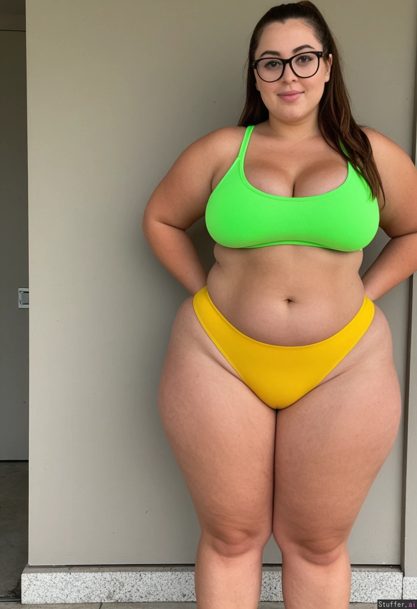 Curvy girl with long brown hair in pony tail Green eyes Wearing round glasses Standing outside Full body view Tan skin Yellow bikini Cleavage showing (Skinny_waist: 1.4) (Extra_Wide_rotund_hips: 1.9) (Thick_oversized_hips: 1.9) (Massive_hips: 1.3) (Thick_thighs: 1.1)