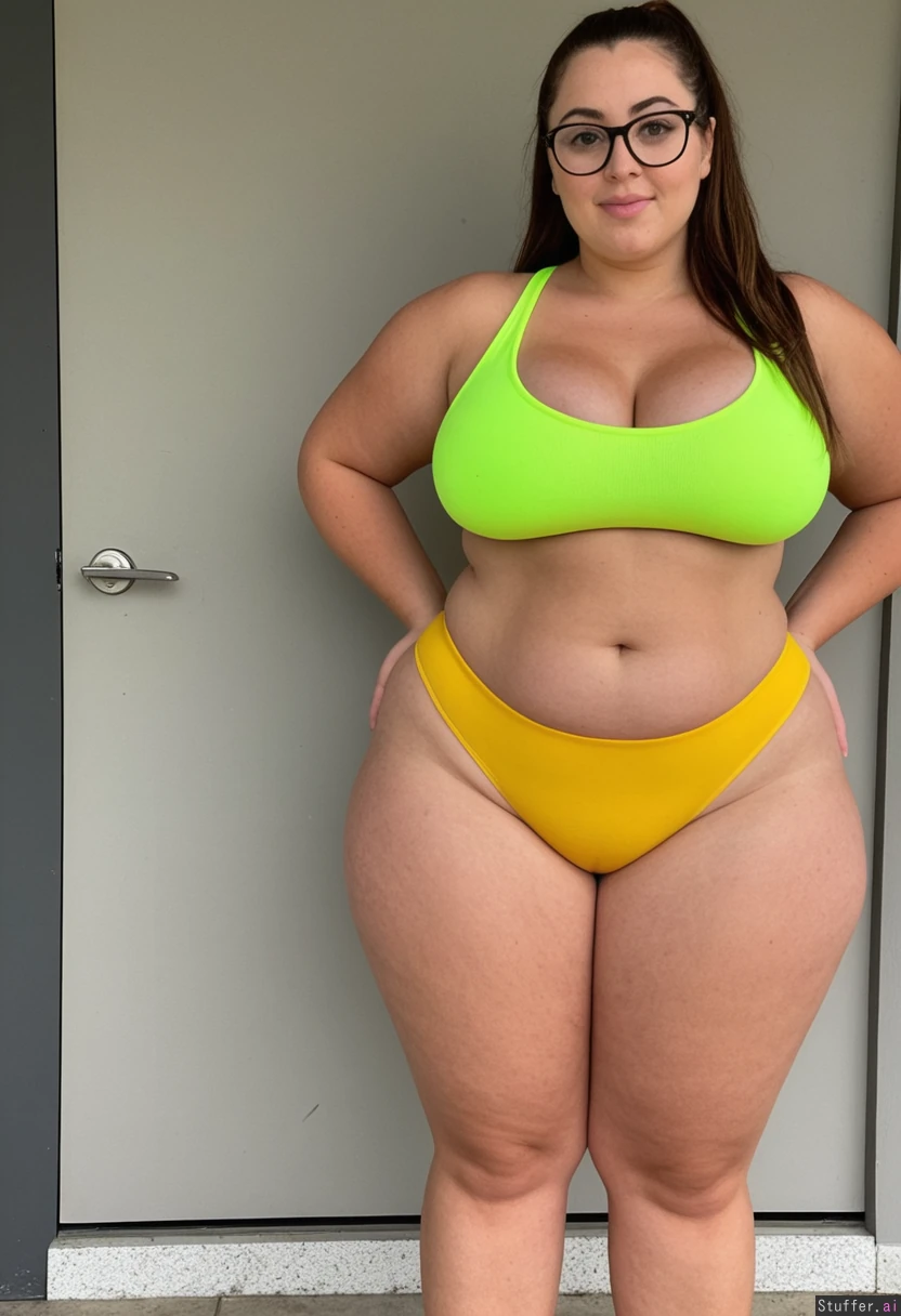 Curvy girl with long brown hair in pony tail Green eyes Wearing round glasses Standing outside Full body view Tan skin Yellow bikini Cleavage showing (Skinny_waist: 1.3) (Extra_Wide_rotund_hips: 1.9) (Thick_oversized_hips: 1.9) (Massive_hips: 1.4) (Thick_thighs: 1.1)