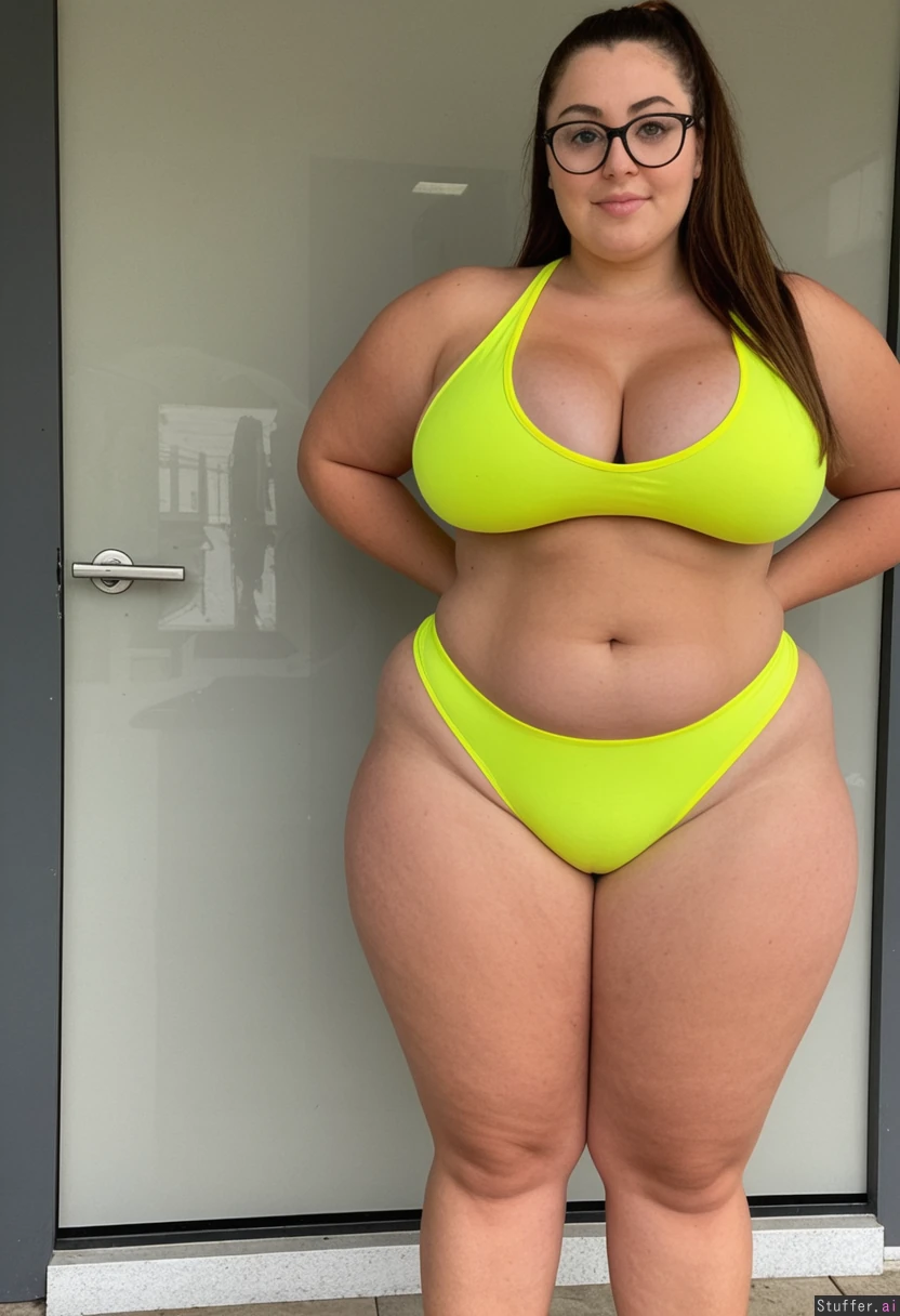 Curvy girl with long brown hair in pony tail Green eyes Wearing round glasses Standing outside Full body view Tan skin Yellow bikini Cleavage showing (Skinny_waist: 1.2) (Extra_Wide_rotund_hips: 1.9) (Thick_oversized_hips: 1.9) (Massive_hips: 1.4) (Thick_thighs: 1.1)
