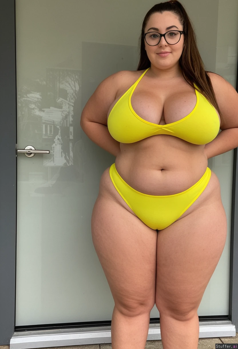 Curvy girl with long brown hair in pony tail Green eyes Wearing round glasses Standing outside Full body view Tan skin Yellow bikini Cleavage showing (Skinny_waist: 1.1) (Extra_Wide_rotund_hips: 1.9) (Thick_oversized_hips: 1.9) (Massive_hips: 1.4) (Thick_thighs: 1.1)