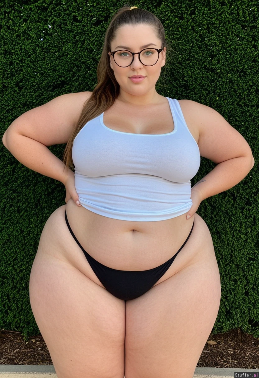 Wearing round glasses, white tank top and black thong
