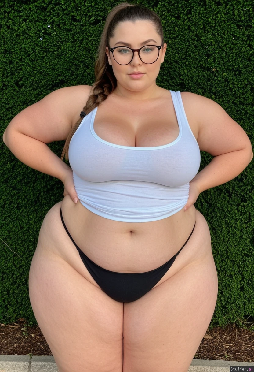 Wearing round glasses, white tank top and black thong