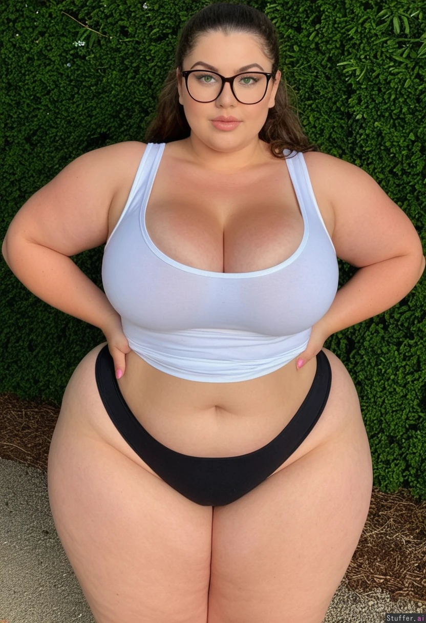 Wearing round glasses, white tank top and black thong