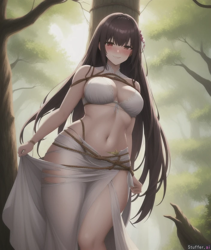 Fantasy, woman in (torn:0.4) white long dress and low waist long skirt, hands tied by rope to top of a tree branch. Flat stomach showing under ripped dress, bra showing under torn dress. Beautiful feminine face, Smiling, blushing.