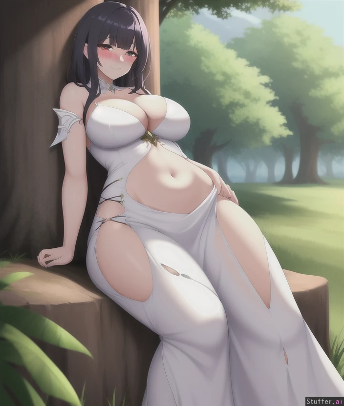 Fantasy, woman in (torn:0.4) white long dress and low waist long skirt, under tree. Flat stomach showing under ripped dress, cleavage barely showing under torn dress. Beautiful feminine face, Smiling, blushing.
