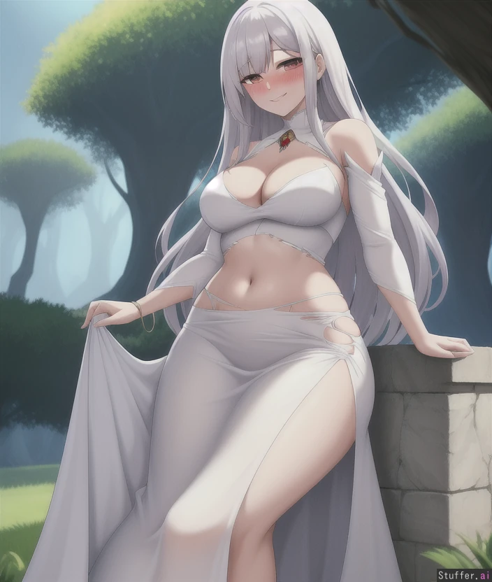 Fantasy, woman in (torn:0.4) white long dress and low waist long skirt, under tree. Flat stomach showing under ripped dress, cleavage barely showing under torn dress. Beautiful feminine face, Smiling, blushing.