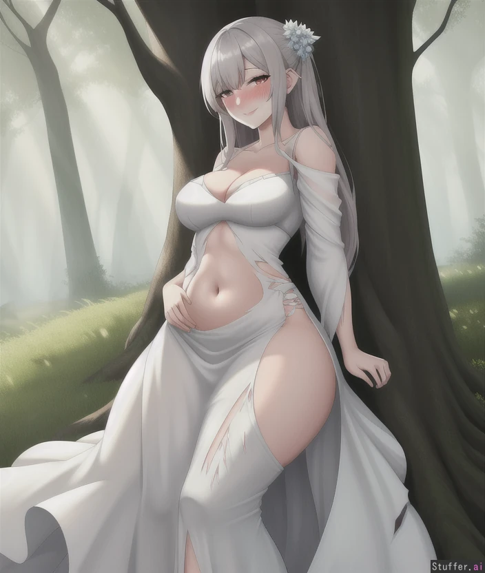 Fantasy, woman in (torn:0.4) white long dress and low waist long skirt, under tree. Flat stomach showing under ripped dress, cleavage barely showing under torn dress. Beautiful feminine face, Smiling, blushing.