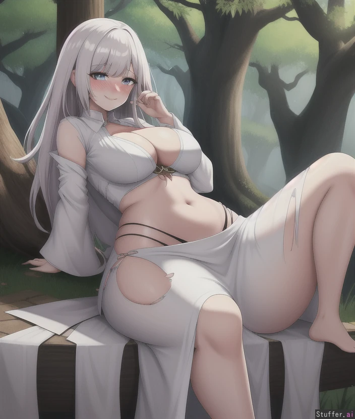 Fantasy, woman in (torn:0.4) white long shirt and low waist long skirt, under tree. Flat stomach showing under ripped dress, cleavage barely showing under torn dress. Beautiful feminine face, Smiling, blushing.