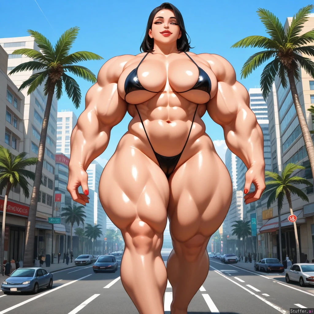 8k, dynamic lighting, absurd_res, uhd, intricate detail, masterpiece, wonderful lighting, volumetric lighting, vibrant colors, detailed surroundings, detailed background, (thick lineart), ultra_detailed_realistic_anime:style, (Korean female:1.3), medium hair, black hair, dark brown eyes, crimson nails & lipstick, she is very pale, (slanted eyes:1.2), K-pop star, mature female, eye makeup, plump lips, glossy colored lipstick & nails, smug, looking down, miniaturized world, miniaturized city, cars, street, crowd of people, giantess, destruction, blue sky, day, palm tree, Miami, skyscrapers, (toned, thick arms, curvaceous body, hyper_muscles, colossal_muscles, thick legs:1.4), thick neck, huge trapezius muscles, wide feet, pudgy hands, pudgy feet, striations, {laying on side|standing on one leg|laying on stomach|laying on stomach, feet up|standing, feet evenly apart|laying on back|crawling|all fours, hanging breasts|all fours, hanging belly|crawling, hanging breasts|crawling, hanging belly|standing, hanging breasts, bending down|standing, bending down, hanging belly|walking|sitting in opulent chair|laying on opulent crimson fainting couch|standing, leaning on building|sitting, leaning on building|laying in pool|laying on beach towl|laying on lawn chair, |stomping|kneeling|sitting}, {from below|from above|straight on|dutch angle}, {side view, huge ass|front facing|three-quarter view, huge ass|from behind, she is looking over her shoulder, huge ass},