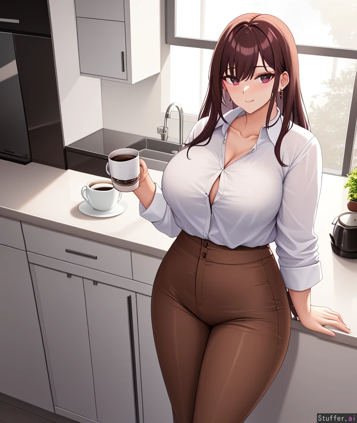 First person view, near kitchen counter, woman in white long shirt and low waist long pants, coffee cup, looking at viewer, . Beautiful feminine face,