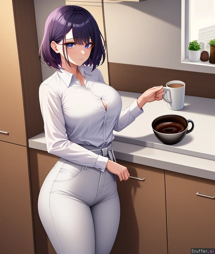 First person view, near kitchen counter, woman in white long shirt and low waist long pants, coffee cup, looking at viewer, . Beautiful feminine face,