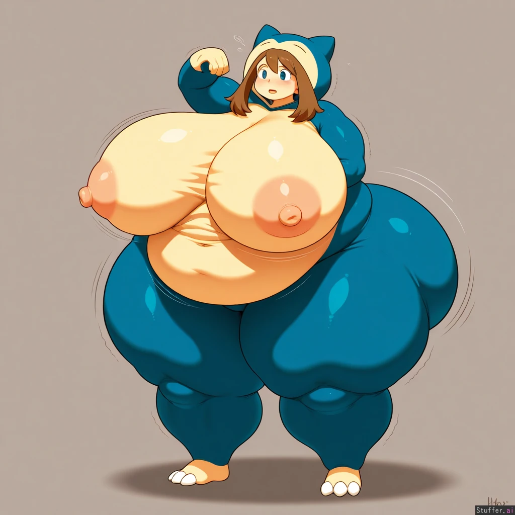 may(pokemon), solo, snorlax (cosplay), gigantic breasts, hyper fat breasts, breasts, gigantic thighs, hyper thighs, gigantic butt, hyper fat ass, fat arms, fat legs, morbidly obese, bouncing, wobbling, jiggling, slut, hot, horny, puffy nipples, (covered nipples, erect nipples),